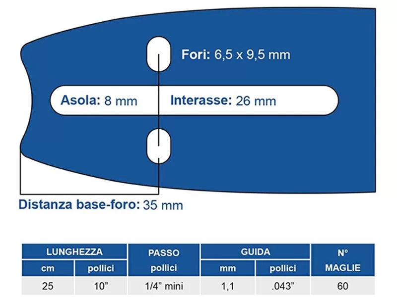 Barra laminata a rocchetto Maya HF10-45GE per motosega 25 cm - 10" - 60 maglie - passo 1/4" mini, spessore 1.1 mm .043" - Attacco barra A041 / T041.