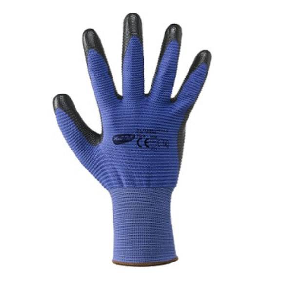 GUANTI NBR BLU / NERO TG.10. Guanto a filo continuo in poliestere, calibro 13 in poliestere/nitrile Palmo ricoperto in nitrile con finitura leggermente rugosa generata...