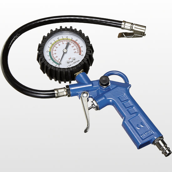 Pistola di gonfiaggio con manometro rivestito in gomma protettiva robusta e corpo in alluminio verniciato a polveri epossidiche per una maggiore resistenza. Dotata di innesto rapido standard. Manometro a doppia lettura: Bar/Psi Pressione di esercizio 8Bar